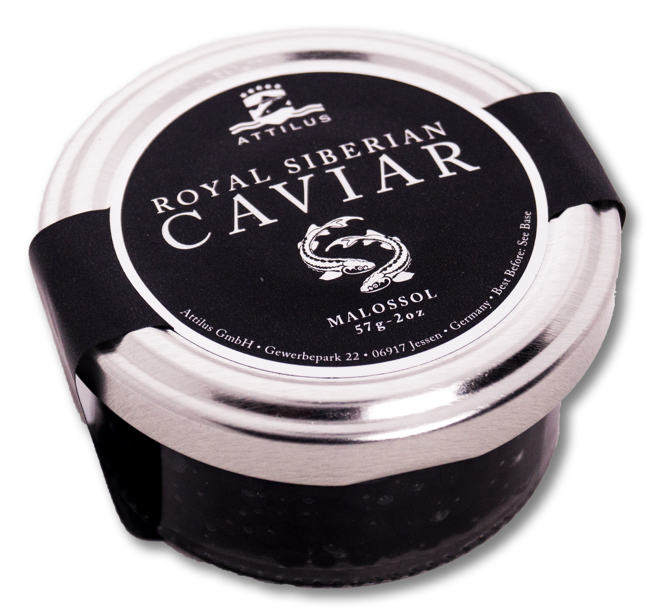 Royal Siberian Caviar, sometimes called baerii caviar, is produced by Siberian sturgeon (acipenser baerii). Siberian is a fine-grained caviar recognised for its pure, elegant flavour and exquisite length which is both fine and clear. Colours range from black/grey all the way to black/brown tones. Attilus Royal Siberian caviar in glass jar is pasteurised malossol caviar which literally means 'lightly salted', salt content being less than 4%.