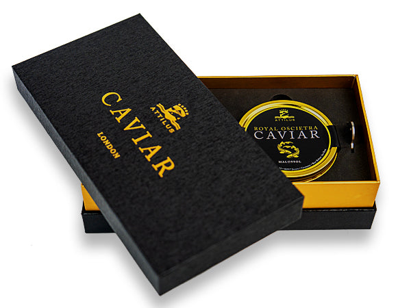This caviar set is presented in an elegant, specifically designed exclusive Attilus Gift Box with four tins of caviar from our selection, as well as a Mother-of-pearl spoon and a caviar tin opener. The set is available for 50g tins only.